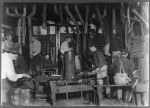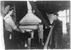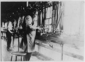 Watch Co., (6 boys of questionable age, but could not get photo of them.) These machines automatically make the tiny screws used in watches: One man tends to 14 machines. A lesson for glass works Mgrs. Location: South Bend, Indiana.