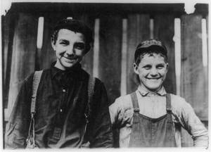 Going home to lunch! Two boys from Singer Mfg. Co., Small boy -- Charles Bailey, 316 Scholum St., Is he Fourteen years old?. Location: South Bend, Indiana.