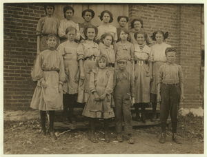 Group of spinners in Elk Cotton Mills. Youngest girl hardly knew her name. Youngest boy runs two sides at ten cents each a day. Location: Fayetteville, Tennessee.
