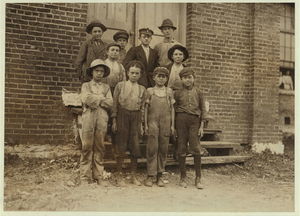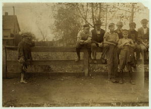 Group of boys, Merrimac Mills, noon-hour. They would not tell me the truth about their ages. Location: Huntsville, Alabama.