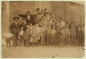 Group of workers. Boy on left refused to pose. Merrimac Mills. Location: Huntsville, Alabama.