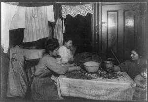 Mrs. Mary Rena, 46 Laight St., 3d floor front, picking nuts with dirty baby in lap. Two neighbors helping. Girl is cracking nuts with her teeth, not an uncommon sight. Mr. Rena works on dock. Location: New York, New York (State)