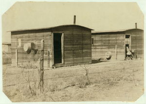 Two new shacks, near Sterling, in which beet workers live. Most of these are old and dilapidated, dirty and crowded. 9 persons live in one of these, 4 in the other. Location: Sterling vicinity, Colorado.