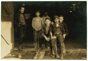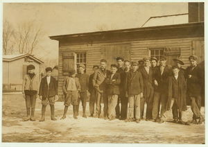 Young girls working in American Woolen Mills, Winooski, Vt. Most are illiterate. Work slack, and force small. (See N.C.L.C. Photos #720-745, May 1909.) 27 Children apparently under 15, were counted at one gate. Location: Winooski, Vermont.