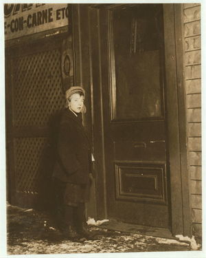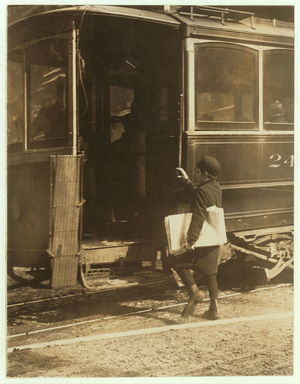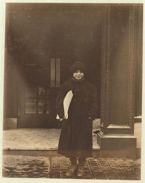 Newsie selling in morning before going to school. Main Street, 8 A.M. Location: Rochester, New York (State)