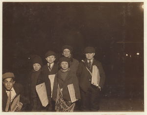 Group on Court St., selling around the "Shea" Theater, 8 P.M. Boy in center - Vito Bucheto, 10 years old, 162 Court St. Behind him to left: Tony Gregoria 12 years old, 69 Front St.,. Location: Buffalo, New York (State)