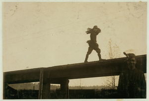 Young boy carrying armful of steel rods, "spragging irons" along the elevated track at the Bessie Mine. Location: Bessie Mine, Alabama.