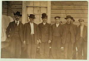 Row of mill men--Maple Mill, Dillon, S.C. Tallest man is the Baptist preacher J .H. Blanton. His son, the third from him, works in mill. Location: Dillon, South Carolina.