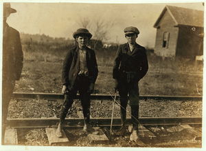 Maple Mills, Dillon, S.C. Lonnie Baker (tallest). Has doffed 4 years. Gets 40 cents a day. Bertie Baser--10 years old. 3 years in mill. Runs 3 sides = 30 cents a day. Location: Dillon, South Carolina.