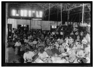 Group of workers stringing beans in J. S. Farrand Packing Company, Baltimore, Md. Many youngsters work here. Photo July 7, 1909. Location: Baltimore, Maryland.