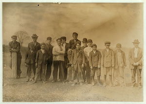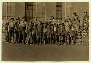Group of boys working in Lancaster S.C. Cotton mills. Smallest boy said he had worked in the mill off and on for five years. Spins now. Location: Lancaster, South Carolina.