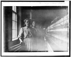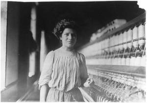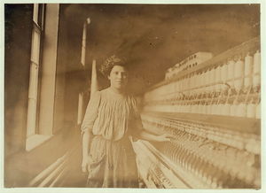 A beautiful young spinner and doffer in Interlaken Mill, Arkwirght, R. I. She has worked there 1 year. Looked 12 yrs. old and had a hectic flush caused by warm, close atmosphere. Location: Arkwright, Rhode Island.