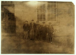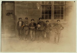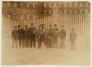 Some of the boys working in Natcik Mills (R. I.) Saturday Noon, April 17, 1909. Location: Natick, Rhode Island.