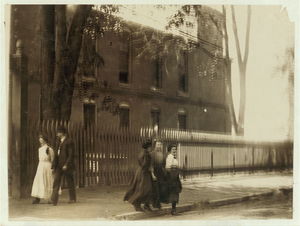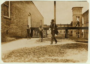Young girls working in American Woolen Mills, Winooski, Vt. Most are illiterate. Work slack and force small. 27 Children apparently under 15 years were counted at one gate. (See also N.C.L.C. Photoes sic #720-745 May, 1909). Location: Winooski, Vermont.