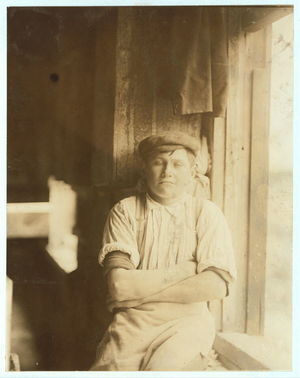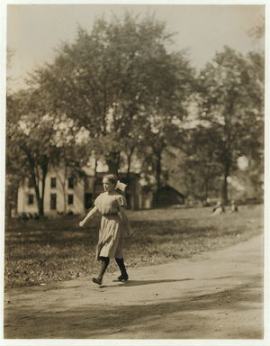 Young girl working in American Woolen Mills, Winooski, Vt. Most are illiterate. Work slack, and force small. 27 Children apparently under 15 were counted at one gate. (See also N.C.L.C. Photos #720-745, May 1909.) Location: Winooski, Vermont.