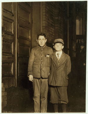 Pack boys in Pacific Mill, George Driscoll, 14 years, Mike Foley, 15 years. Been working 1 1/2 years. Location: Lawrence, Massachusetts.