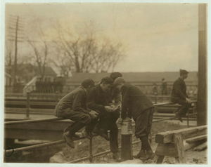 Dangerous Noon-hour Recreation. Doffer boys and others from Pacific Mills. Location: Lawrence, Massachusetts.