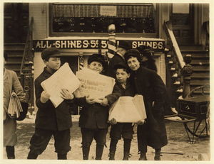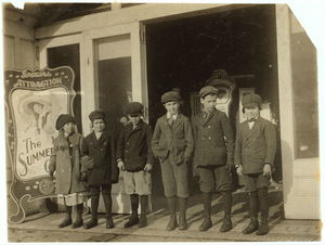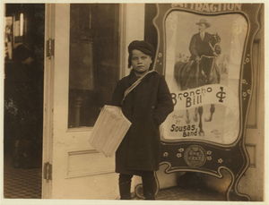 Newsie, ten years old. Going into a moving picture theatre with his papers. Location: Schenectady, New York (State)