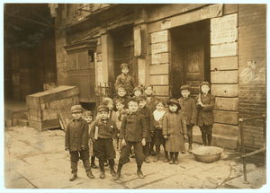 3:30 P.M. Group in tenement hallway. Ages, 14 months, 2, 5, and 7 years. Mother in shop sewing. Father out of work, bartender. Family, Novi, 189 Chrystie Street. Location: New York, New York (State)