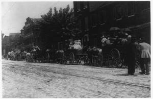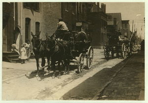 A street full of Baltimore immigrants lined up and ready to start for the country to the berry farms. Wolfe Street, near Canton Avenue, Baltimore, Maryland. Courtesy of Maryland Child Labor Committee. Location: Baltimore, Maryland.