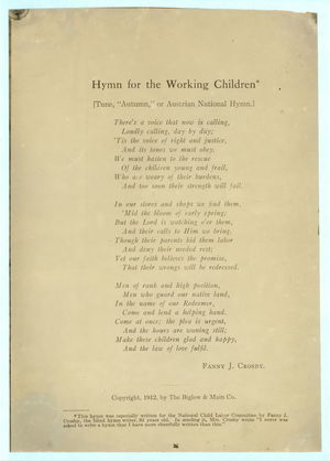 Printed page of text: "Hymn for the Working Children" by Fanny J. Crosby.