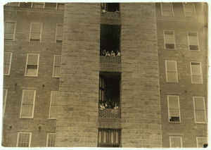 Noon hour - Merchants Mill. Girls flirting with passersby. Location: Fall River, Massachusetts / Lewis W. Hine.