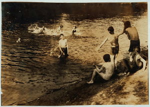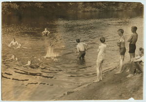 The Swimming Hole. Group of boys - 14 to 16 years - just returned from working in tobacco at Southwick, Mass., on Galpin's farm. Location: Westfield, Massachusetts / Lewis W. Hine.