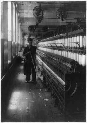 King Philip spinning room. Sweeper and cleaner Adelaid Levesque, 1152 Slade St. Age 14 - Looks larger because camera low. Location: Fall River, Massachusetts / Lewis W. Hine.