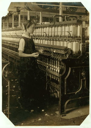 King Philip Spinning Room. Spare Hand on spinning frames Hannah Mills, 603 Dwelly St. 15 years old. Location: Fall River, Massachusetts / Lewis W. Hine.