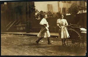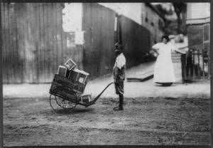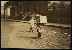 Carrying tags. A little tot with a heavy load. Location: Roxbury, Massachusetts.