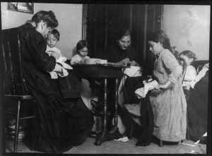 Typical group of workers on tags. Steps of Mrs. Dolan, 279 Highland Street, Roxbury, Mass. Location: Roxbury, Massachusetts.