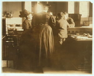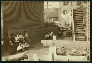 This is typical of the home work on underwear in these quarters. Mother and children and surroundings all filthy. 4 Me Culphe Place, Somerville, Mass. Location: Somerville, Massachusetts.