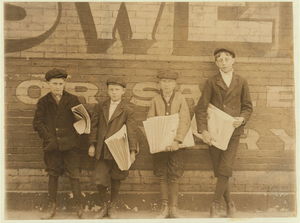 Newsies selling near saloon. Location: St. Louis, Missouri.