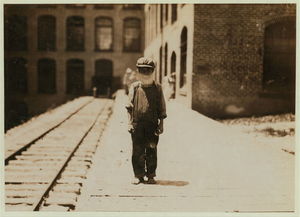 One of the young doffers in Washington Cotton Mills, Fries, Va., going to dinner. Said he was 15 years old, but it is doubtful. Location: Fries, Virginia.