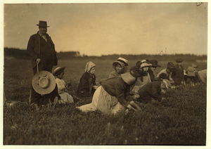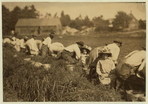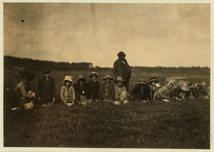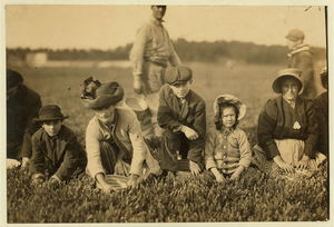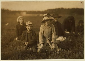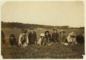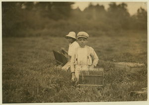 Annette Roy, the youngest worker. Said 7 years old. Picked last year. Lives 171 Orange Street, Fall River, Mass. Also Napoleon Ruel, 53 Hopkins Street, Fall River, Mass. Said 9 years old. Location: South Carver vicinity - Smart's Bog, Massachusetts.