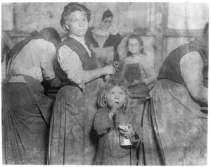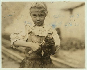 Shuckers in the Varn & Platt Canning Company. This is 4 year old Mary in the foreground. Was helping some. 6 of the shuckers were 10 years and up to 12. Location: Younges Island, South Carolina.
