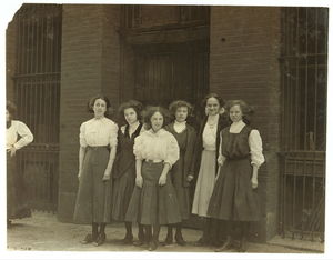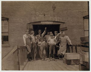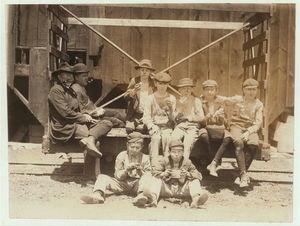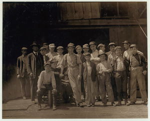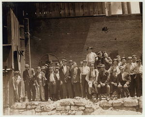 Group of glass workers Shops 6 & 7, Illinois Glass Co. 12:45 P.M. Even the tiny chap on left end of photo was working. He is a Polish boy who cannot understand English. I saw him at work just before 1 P.M. Location: Alton, Illinois.