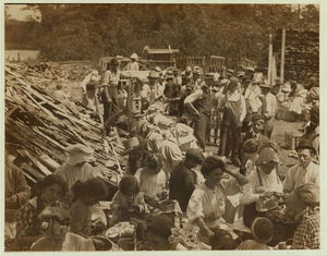 Family group hulling strawberries in the sun at Johnson's Hulling station, Seaford, Del. Note the child of about 5 years of age in the centre of the picture with sharp, long knife hulling berries. Location: Seaford, Delaware.
