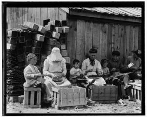 Small family group hulling berries at Johnson's Hulling Station, Seaford, Del. Location: Seaford, Delaware.