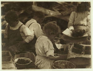 3 year old girl and 2 boys hulling berries at Johnson's Canning Camp, Seaford, Del. Location: Seaford, Delaware.