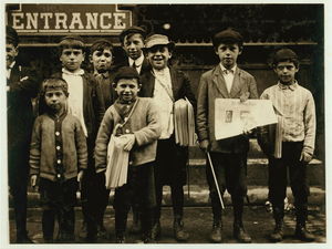 Newsboys, begging tobacco coupons. Edward F. Brown, Investigator. Lewis W. Hine. Photographer. Location: Philadelphia, Pennsylvania.