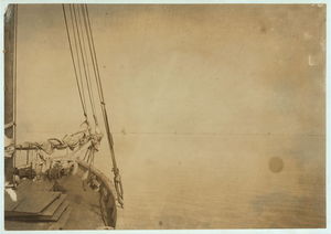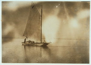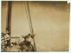 Oyster barge approaching the oyster fleet on the reef, Mobile Bay. Location: Mobile Bay, Alabama.