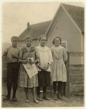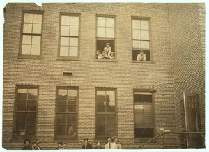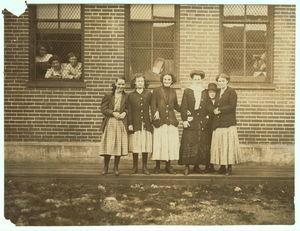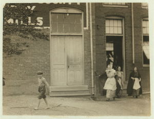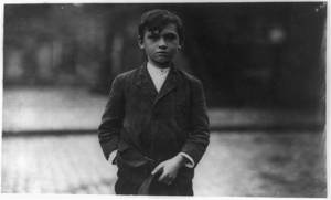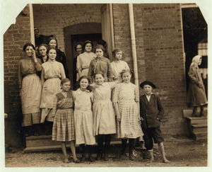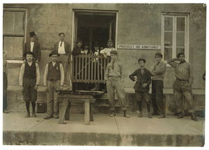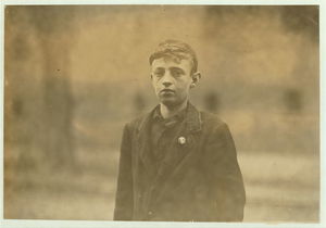 Smallest boy in group is Duke Gray, 66 Coburn Street, doffs in No. 1 spinning room and has been there one month. Seems 13 years old. Location: Lowell, Massachusetts.