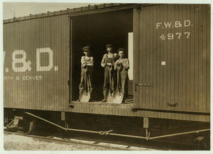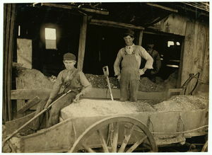 Three Boys Shoveling Zinc Ore from Car Into Wagon, Near Big Bonanza Mine, Aurora, Mo. Youngest boy is Robert Nichols, next larger is Hobart Crawford. They both go to school and work on Saturdays. The other boy works every day. Location: Aurora, Missouri.