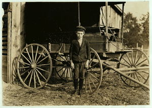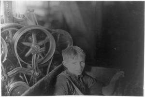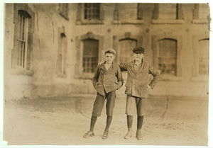 Two boys working in Coventry Co. Mill, Anthony, R. I. 6 P.M. April 16, 1909. I saw about 10 boys and girls who looked to be under 14 years of age. Location: Anthony, Rhode Island.