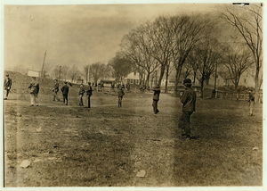 Noon hour ball-game at Quidwick Co. Hill, Anthony, R. I. All of them work in the mill. Note the boy nearest. Location: Anthony, Rhode Island.