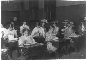 Working Girls of all Nationalities Making the Best of the Spare Evening Hours. Boston 1915 Exhibit. Location: Boston, Massachusetts.