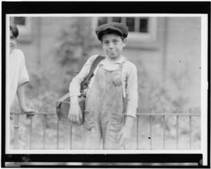 Two of the youngest newsboys in Hartford, Connecticut. They are cousins eight and ten years old. August 25, 1924. Location: Hartford, Connecticut.