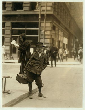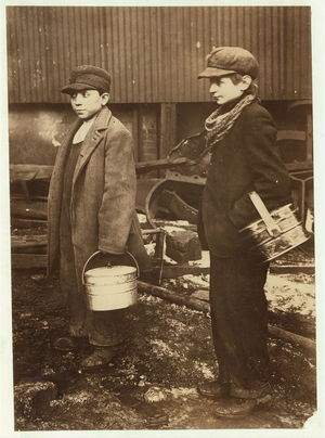 Going to their work at 5 P.M. "Sheeny Joe's" Glass House, January, 1913. Boy to left is 15 years old, can't speak English. Location: Pittsburgh, Pennsylvania.