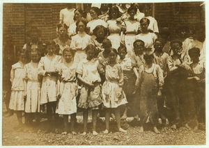 The Supt. and the group of children under sixteen years starting work after noon, May 9, 1911. Location: Yazoo City, Mississippi.